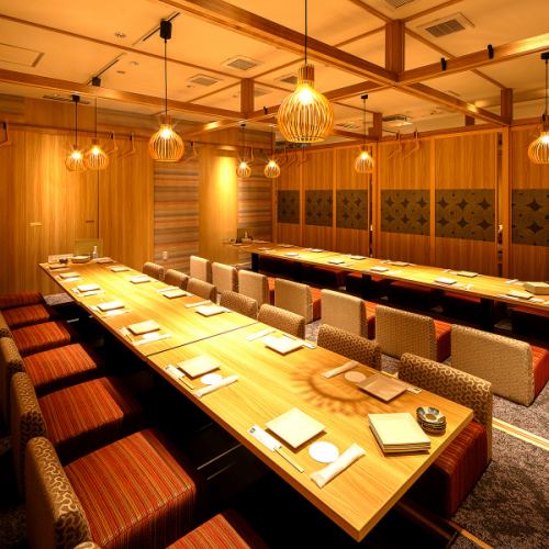 【大人数宴会も歓迎♪】 こだわりのお料理を最大限にお楽しみいただける上質な個室空間でお客様をおもてなしいたします。風情を感じさせる落ち着いた個室で、ゆったりとした楽しいひと時をお過ごしください。同窓会から接待、会社宴会まで、様々なシーンにご利用いただけます。